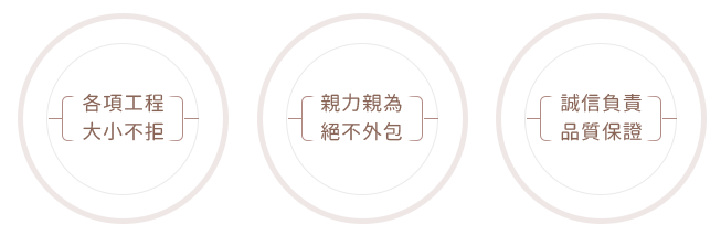 我們的承諾是,無論工程的規模如何,我們都會以最優秀的工作效率和公道的價格來滿足客戶的需求,我們追求的不僅僅是外在的美觀,更是打造出安全、舒適且富有品味的生活空間,我們由衷期待著能夠繼續得到您的支持,這將是我們前行的動力,也歡迎設計公司及裝潢公司等其他行業配合。
